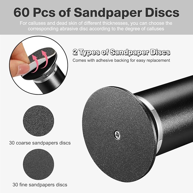 - Comes with 60 replacement sandpaper discs: The electric callus remover for feet set includes 30 fine sandpaper discs and 30 coarse sandpaper discs, with strong self-adhesive ability, easy to stick and remove, convenient to replace and easy to use