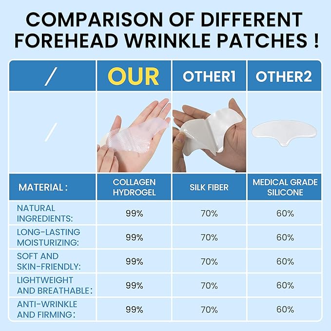 - Effective Forehead Wrinkle Removal - Our collagen forehead wrinkle patches with skin-friendly hydrogel texture is full ofcollagen ingredients to moisturize and nourish skin deeply, Continuous use of thispatch can prevent & smooth wrinkles and repair skin effectively. perfect for those seeking a non-invasive solution.