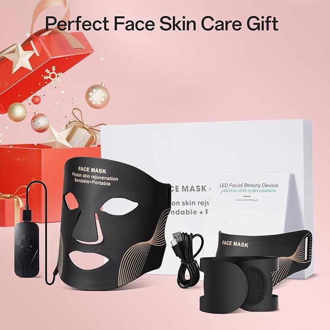Red Light Mask for Face and Neck - Facial Skin Care Device, Portable, Lightweight, Rechargeable and Ergonomic Design for Home (Black)