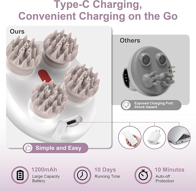 - 【USB-C Charging and Mini Size】 Hair Massager USB-C charging. Being lightweight (0.5 lbs) and compact, it’s convenient to carry in a handbag to let you enjoy soothing massage anytime, anywhere Tips: Do not insert your hands into the four massage heads while using the massager.