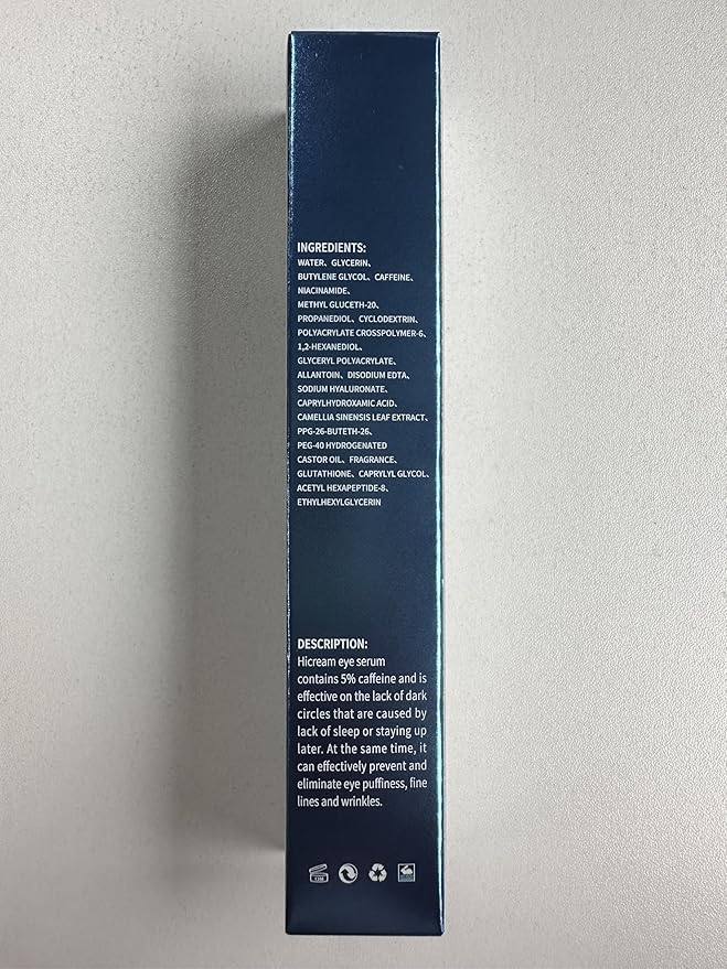 - Caffeine eye cream: Hicream Eye Serum with 5% Caffeine, reduce puffiness, dark circles, fine lines and wrinkles around the eyes, It deeply hydrates the delicate skin around your eyes, visibly smoothing and firming for a refreshed appearance.