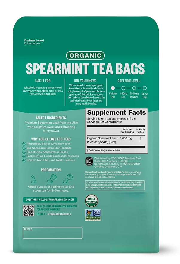 FGO Organic Spearmint Leaf Herbal Tea, 20 Count, Eco-Conscious Tea Bags, Caffine Free, Resealable Bag, Packaging May Vary (Pack of 1)