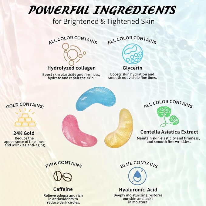 - Comprehensive Eye Mask Gift Set: This gift set includes 24 pairs of under-eye patches in three vibrant colors, each designed for specific benefits: 24K Gold Masks for smoothing wrinkles and boosting elasticity. Pink Caffeine Masks to reduce dark circles and refresh tired eyes. Blue Hyaluronic Acid Masks for deep hydration and soothing moisture. It’s a luxurious, all-in-one solution to elevate any self-care routine.
