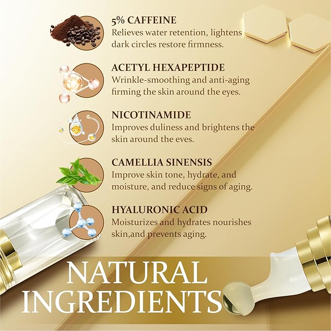 - 5% Caffeine Content Precision: Contains 6% high-concentration caffeine to effectively reduce puffiness and dark circles. After repeated adjustments, 6% caffeine has proven to be one of the most effective concentrations for revitalizing the eye area, making it ideal for those seeking a potent eye serum to eliminate puffiness and bags.