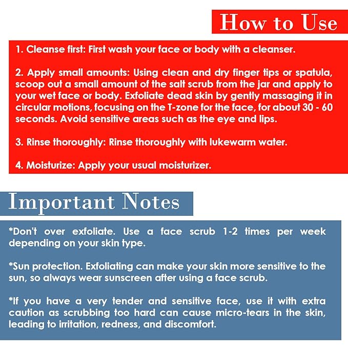 - Deep Cleansing Formula: Experience the ultimate skin refresh with this powerful Dead Sea Salt Scrub. Its deep-cleansing action penetrates pores to remove impurities and excess oil, helping to prevent breakouts while leaving your skin purified, and balanced.