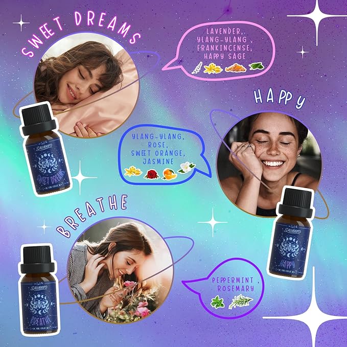 - Uncover the Secret to Relaxation: 6-bottle wellness essential oil collection (10ml each) featuring sweet dreams, happy, breathe, energy, relax, and inspiration blends oil. Add 5-10 drops to your diffuser to experience harmonious aromas that melt away tension.
