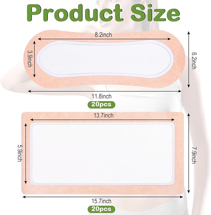 - Multi-size Design: 20 pcs in extra large size and 20 pcs in neck size; The former size, 40 x 20 cm/15.7 x 7.8'', fits the waist of most people's body types and also fits other large areas such as the liver, back, arms, legs, etc. The latter size, 30 x 11 cm/11.8 x 4.3'', is designed to fit the curve of the neck and can also be applied in other small areas such as joints, wrist, abdomen, calf, etc. The self-adhesive castor oil wrap does not require additional binding, making it more convenient