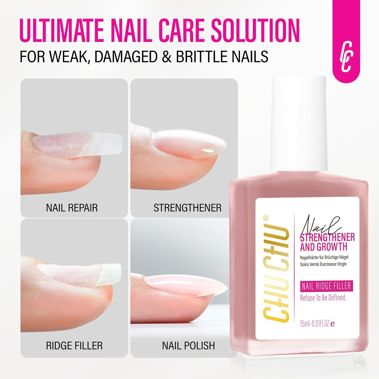 - Elevate Your Manicure with Our 8-in-1 Nail Repair Strengthener: Experience the ultimate nail care with our updated formula that combines Nail Protein Growth, Strengthening, Base Coat, Nail Ridge Filler, Nail Repair, Quick-Drying, and High-Gloss in one bottle. Perfect for everyone, this versatile solution simplifies your nail routine and enhances any nail art design effortlessly.