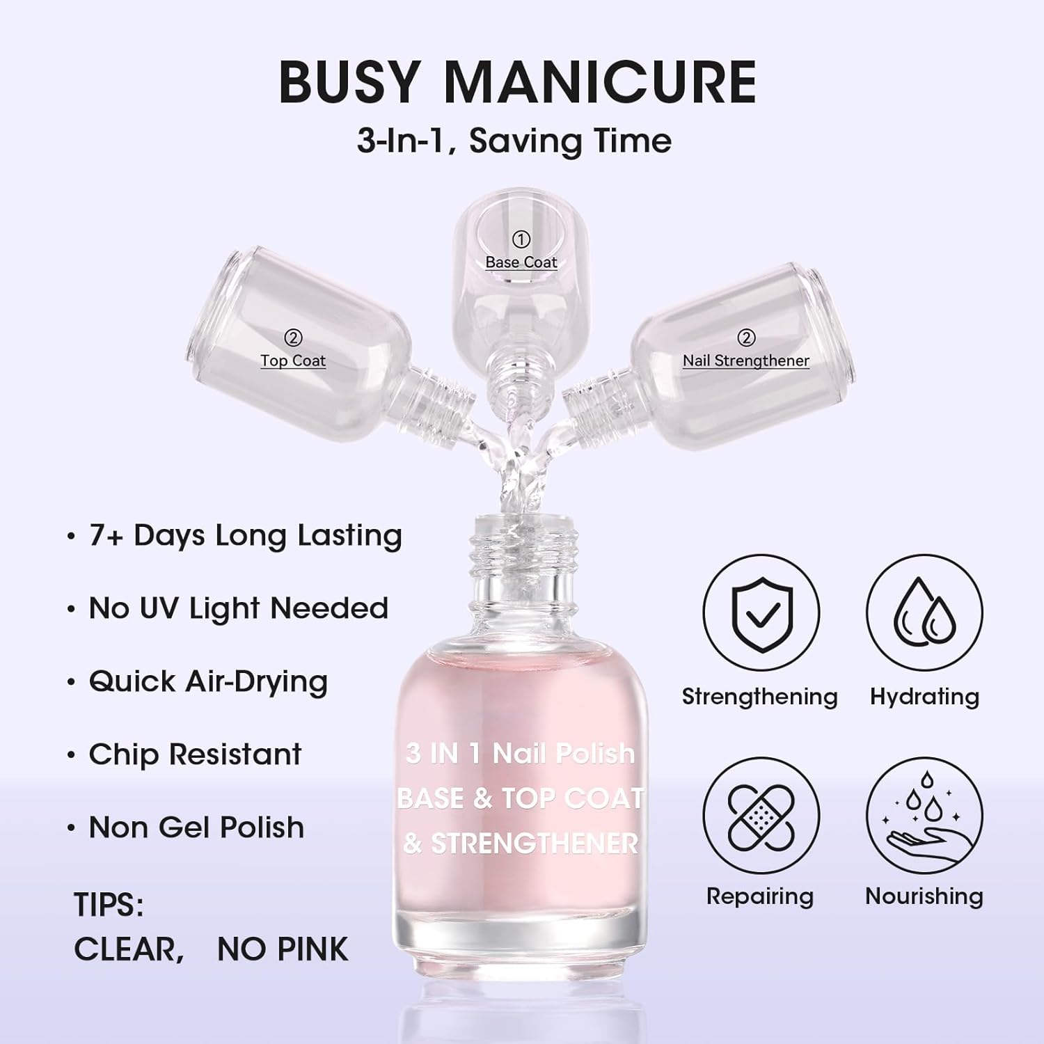 - 3-in-1 Formula: Base coat + top coat + nail strengthener in one bottle - saves time and money. Quick Air-Dry – dries fast