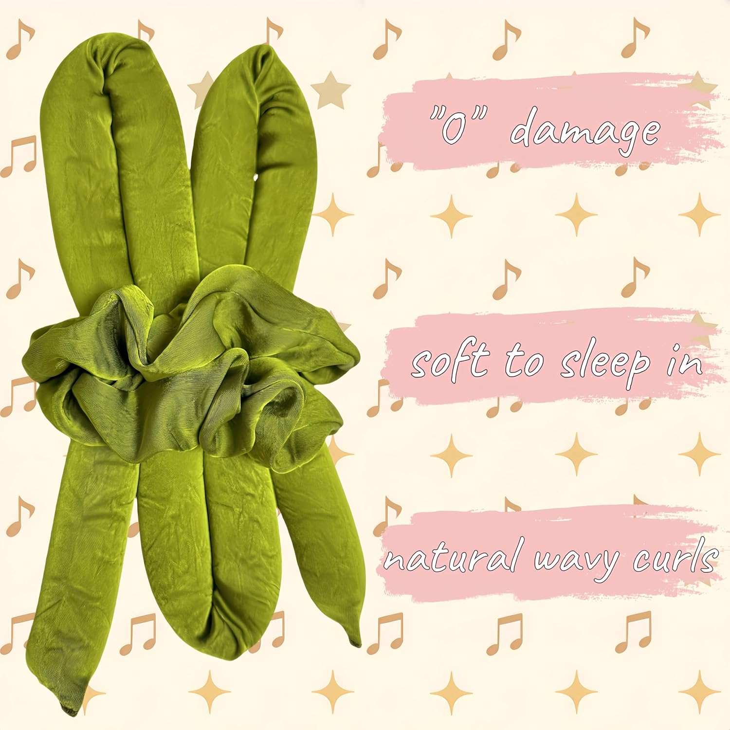 Serenade Textured Satin Heatless Curls Overnight, Heatless Hair Curler Curling Set for Women and Girls to Sleep in, with 2 Satin Scrunchies and 1 Clip for Overnight Curls, Green